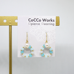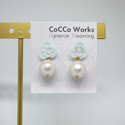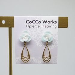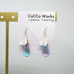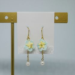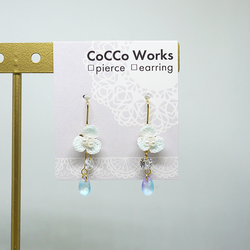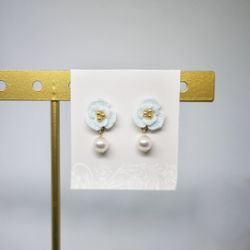 044 フラワーピアス(薄ブルー×パール&ゴールドビーズ/ドロップビーズ)