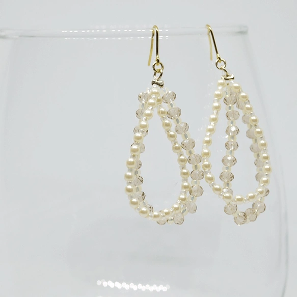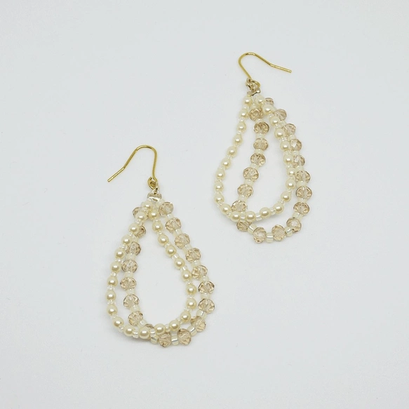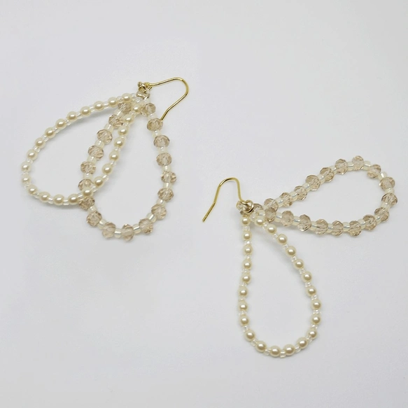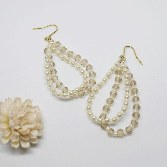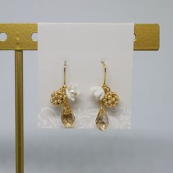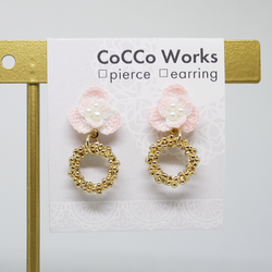 042 フラワーピアス(ピンク×パール&ゴールドビーズ/ドロップビーズ)