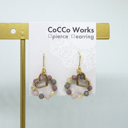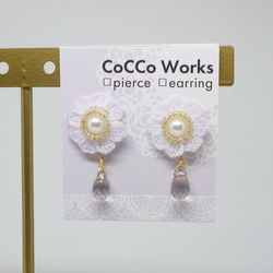 043 フラワーピアス(パープル×パール&ゴールドビーズ/ドロップビーズ)
