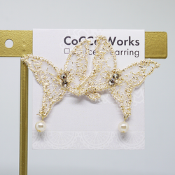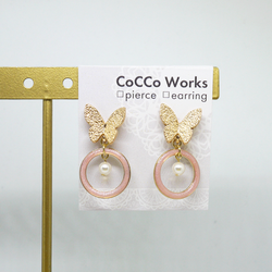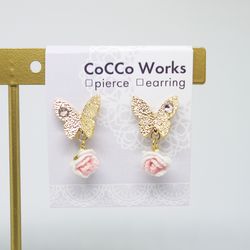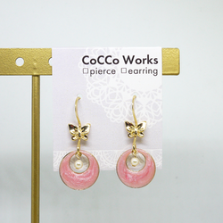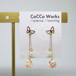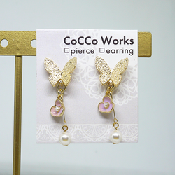 041 2段のフラワーピアス(マーブルピンク×オーロラクリスタル×バタフライ)