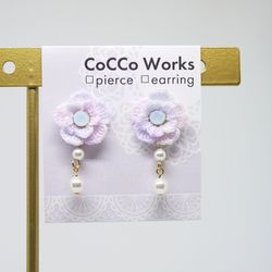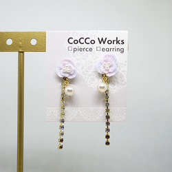 065 二重フラワーピアス(薄パープル/オーロラクリスタル/2連パール)