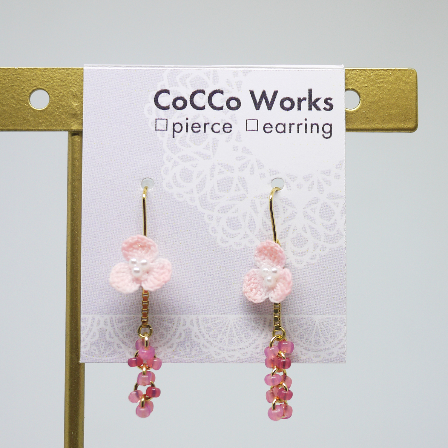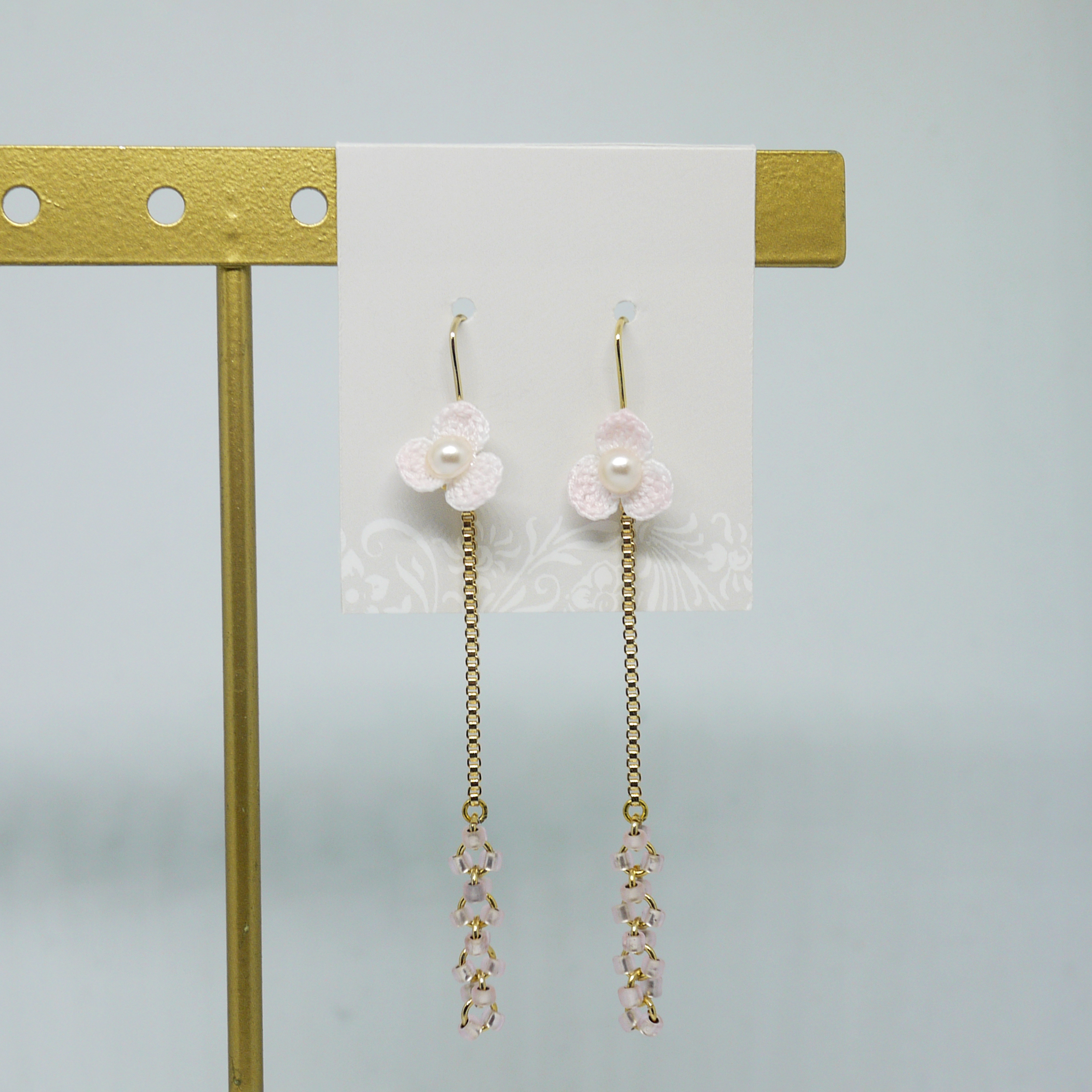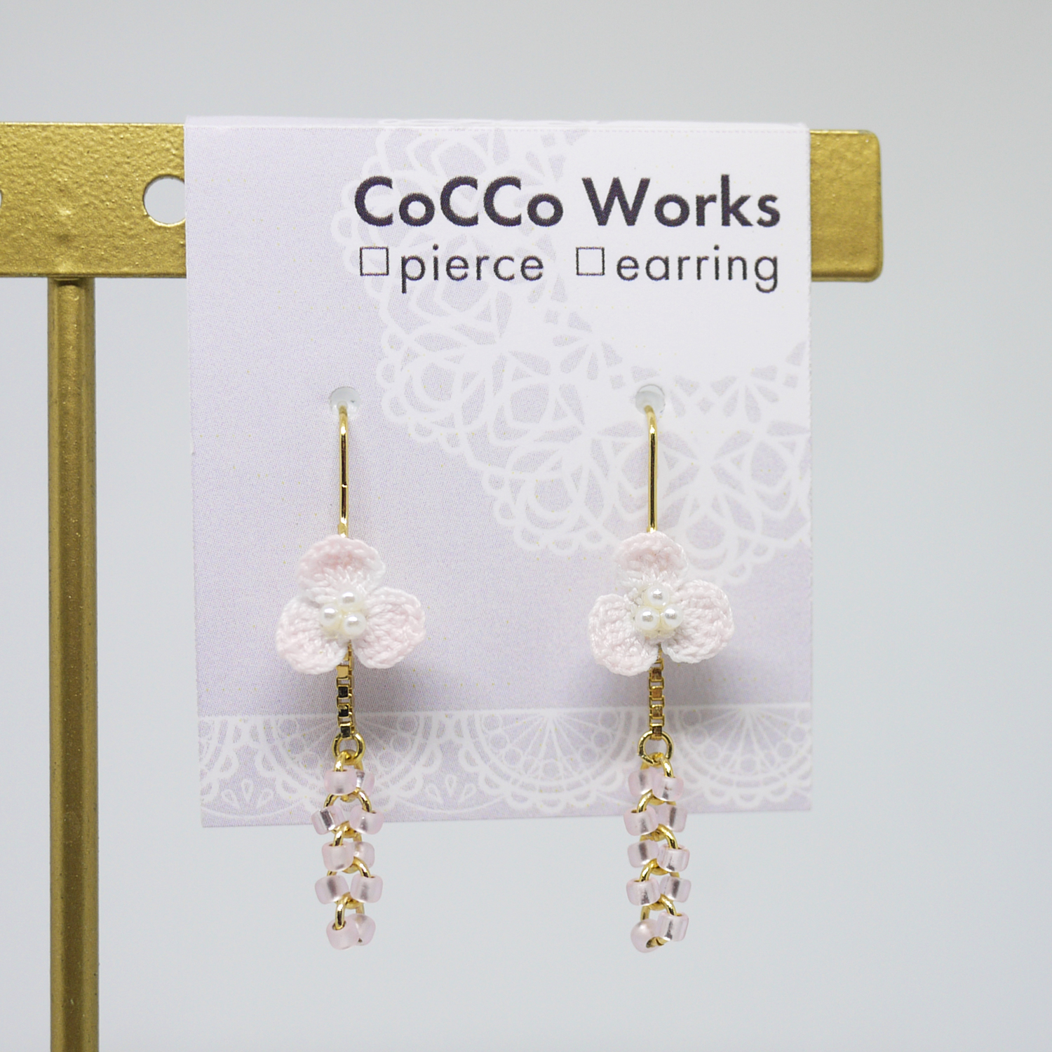 082 ビーズチェーンとお花のピアス(ピンク/艶消し)