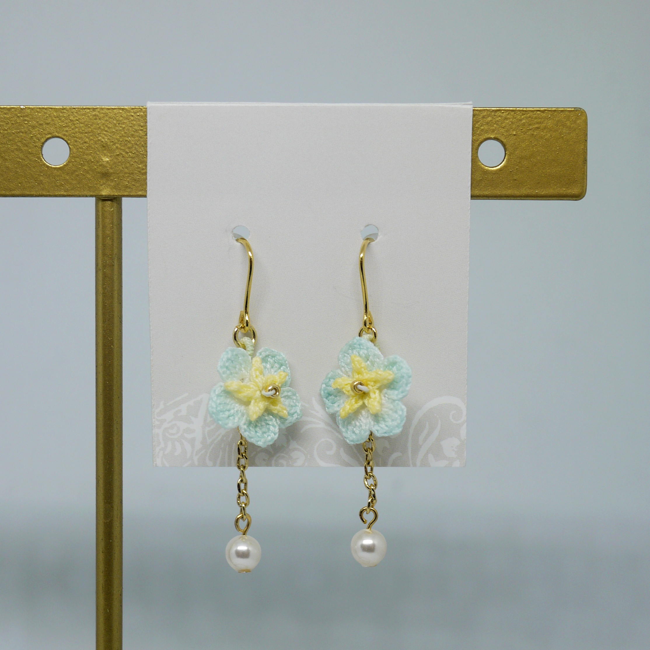 044 フラワーピアス(薄ブルー×パール&ゴールドビーズ/ドロップビーズ)