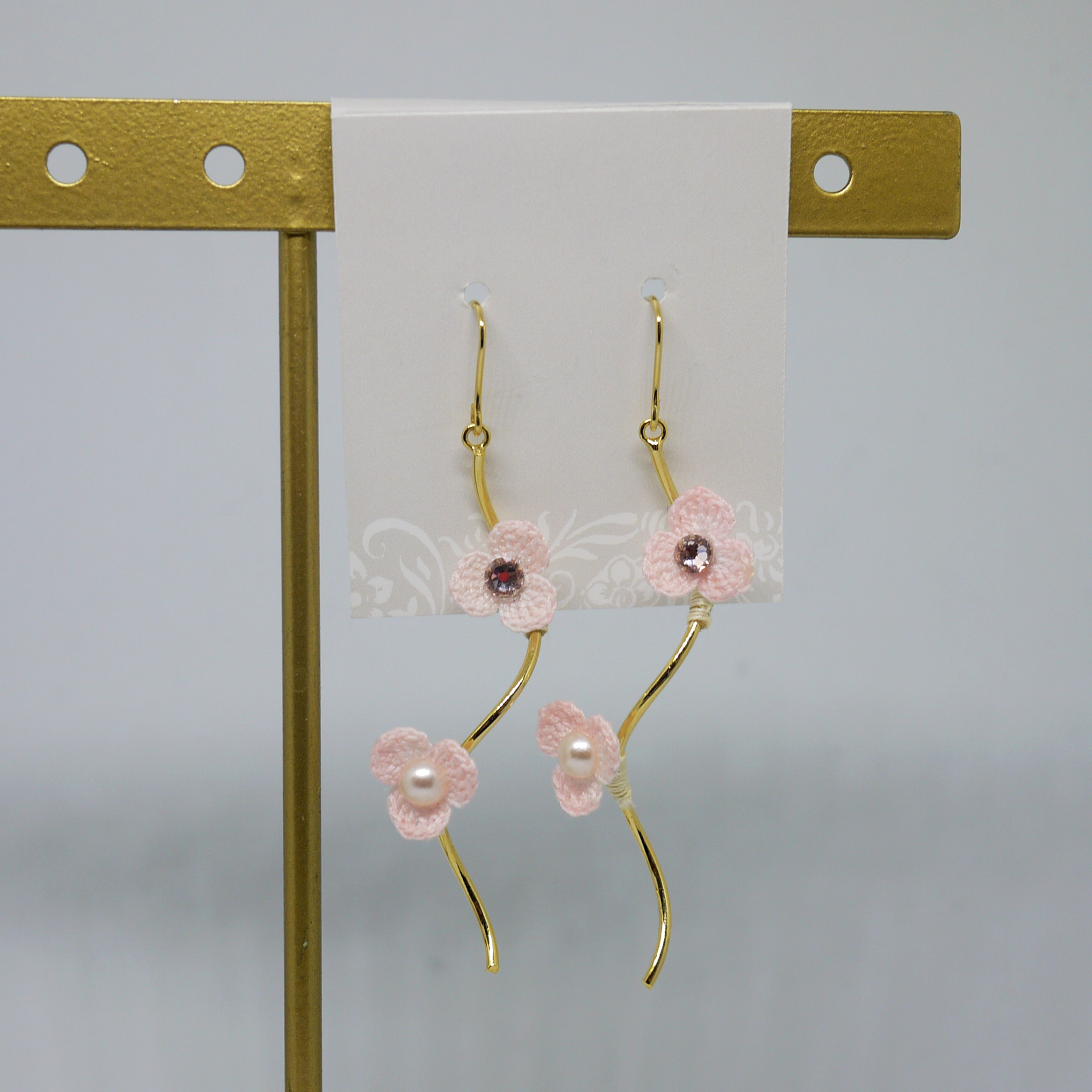 009 お花ピアス(アシンメトリー/スワロ/ピンク)
