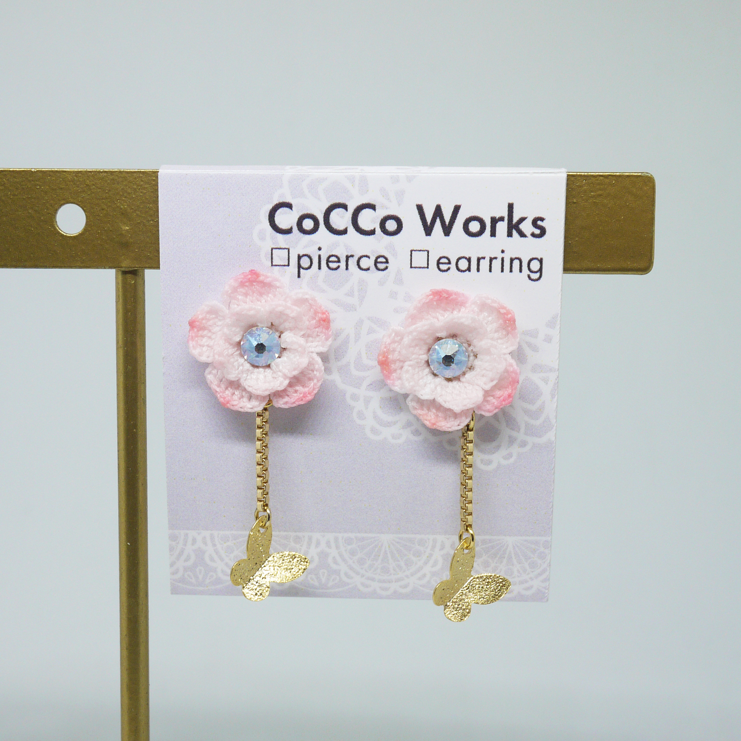 041 2段のフラワーピアス(マーブルピンク×オーロラクリスタル×バタフライ)