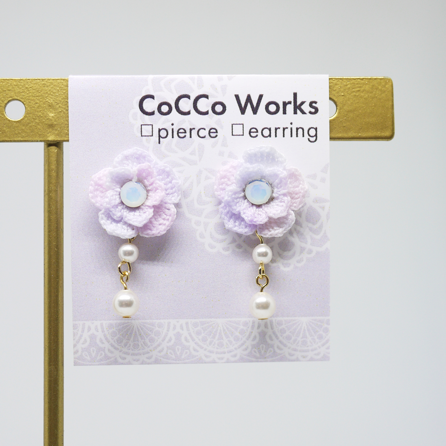 065 二重フラワーピアス(薄パープル/オーロラクリスタル/2連パール)